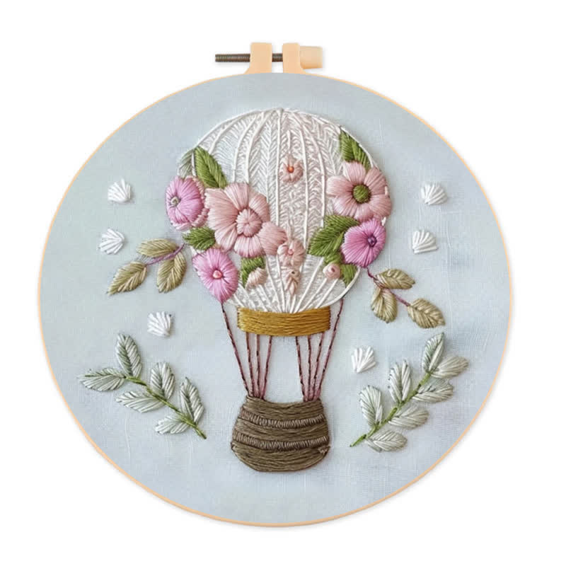 Rubbyoo Embroidery Kit -Dreamy Hot Air Balloon with Pastel Flowers | Needlework Gift For Beginners