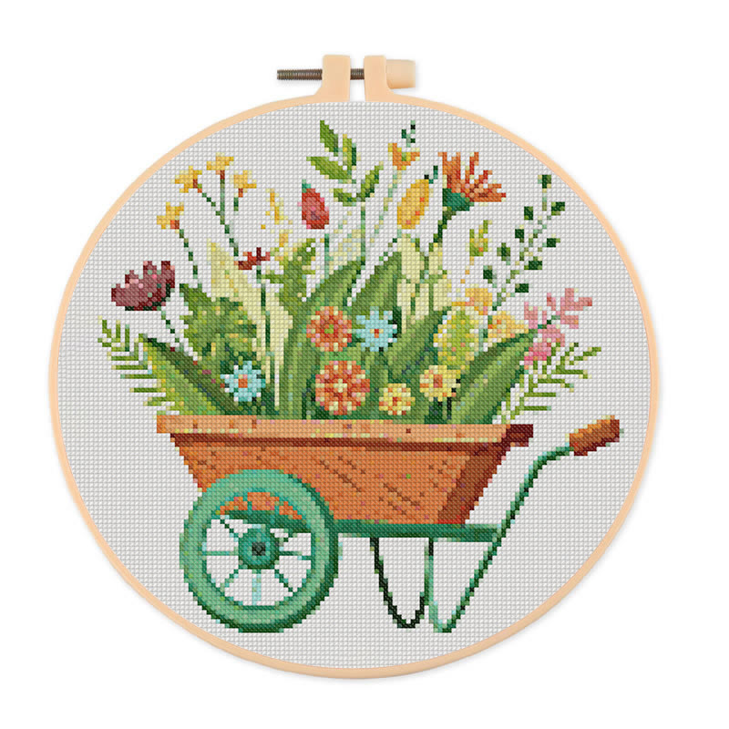 Cross Stitch Kit - Blooming Flower Wheelbarrow | Diy Handmade Craft | Unique Room Ornament