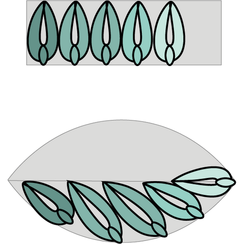 Detached chain stitch fill. Fill a shape with rows of detached chain stitches. Line the stitch up parallel to each other (top) or create them at variable angles to better fit the shape (bottom).