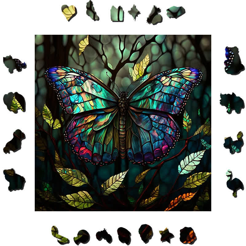 Brightly colored butterfly in a forest - Wooden Jigsaw Puzzle