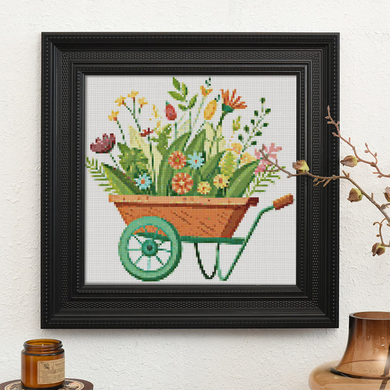 Cross Stitch Kit - Blooming Flower Wheelbarrow | Diy Handmade Craft | Unique Room Ornament