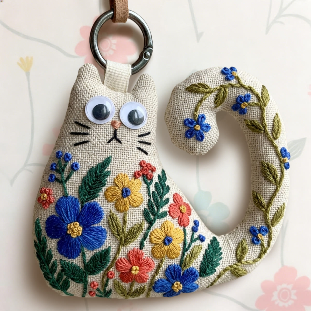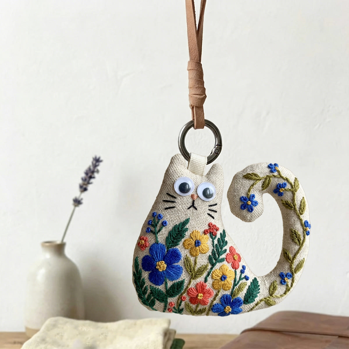 Rubbyoo Cat Embroidery Kit - Colorful Wildflower And Leafy Vine | Handmade Gift For Her | Cottagecore Bag Charm